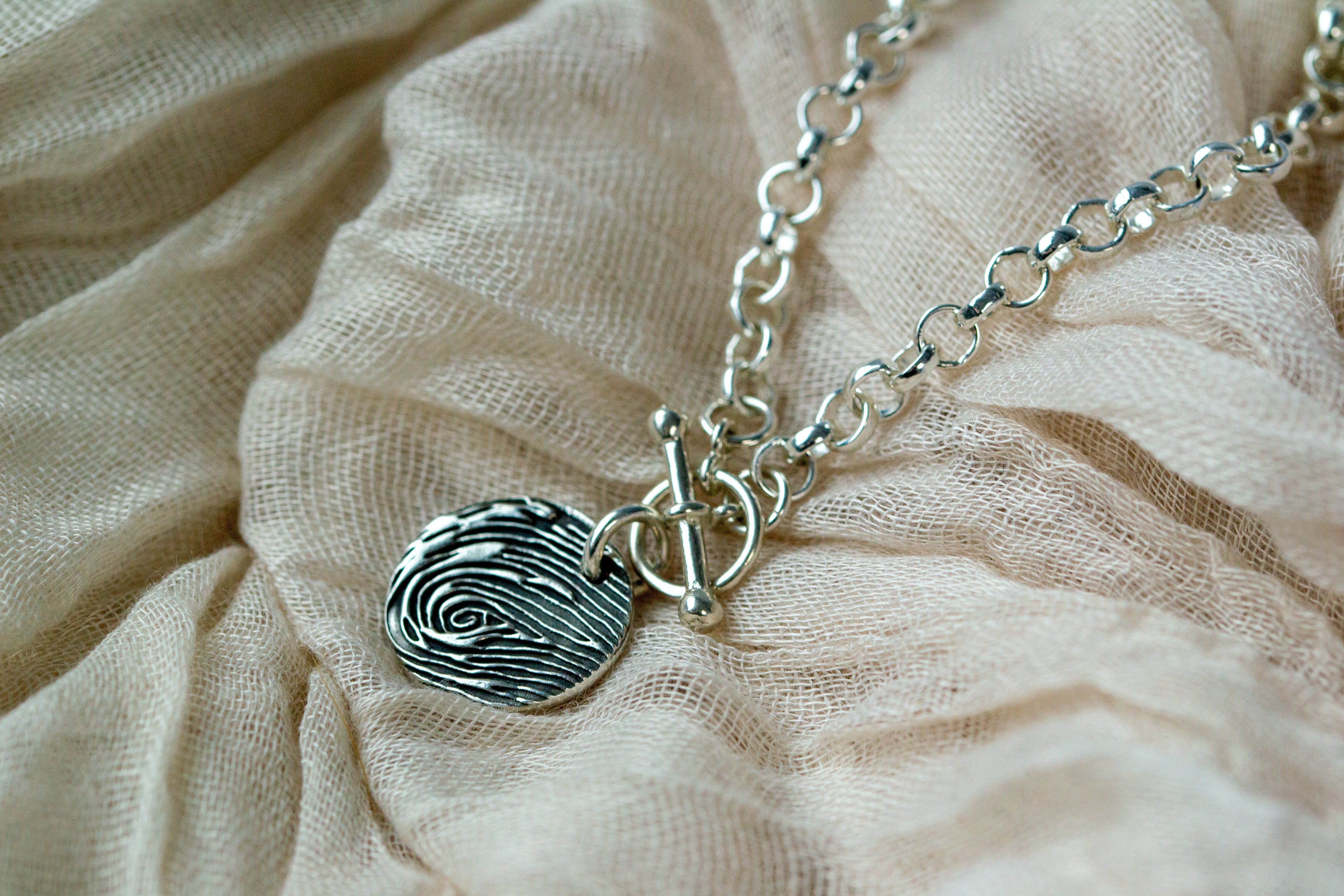 Capture the unique texture of a fingerprint on a sterling silver charm and showcase it on one of our Italian-made belcher chain bracelets. If you have an ink fingerprint ready, simply upload it with your order. If not, add an ink fingerprint kit to create your charm. Choose from a variety of charm shapes and enjoy the option to have a name and age engraved on the back—everything is included in the price! This elegant combination of fingerprint jewellery and high-quality craftsmanship makes for a truly special keepsake.