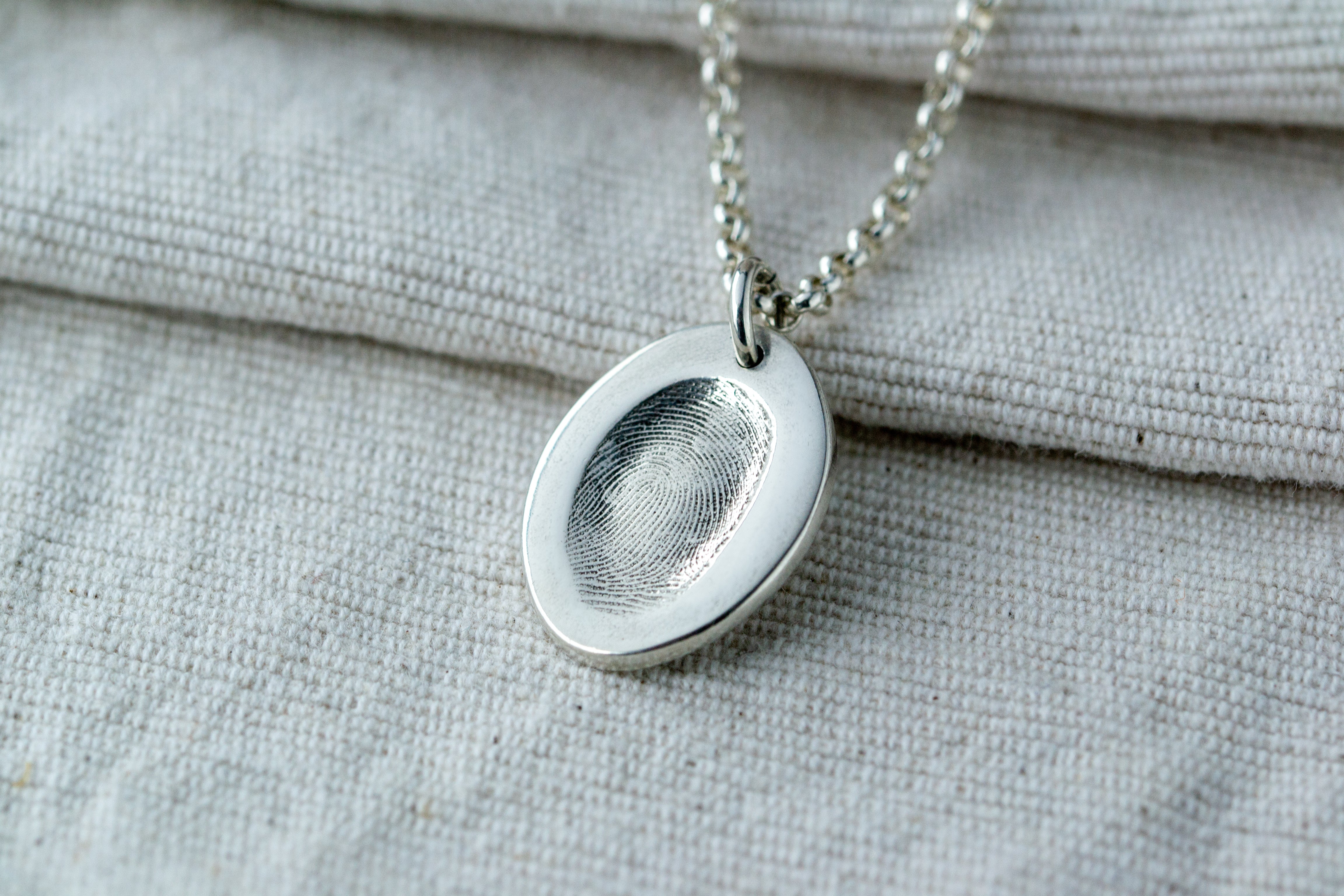 Showcase your unique fingerprint jewellery in style, with your love one's actual fingerprint captured in sterling silver—just as meaningful for adults! Visit a local jeweller for the impression or use our moulding kit at home to create the perfect pendant. Choose from a variety of shapes, with a hand-engraved name and age included. Complete the piece with one of our Italian-made, refined sterling silver fine belcher chains, available in five sizes, and optionally add a birthstone for a personal touch.