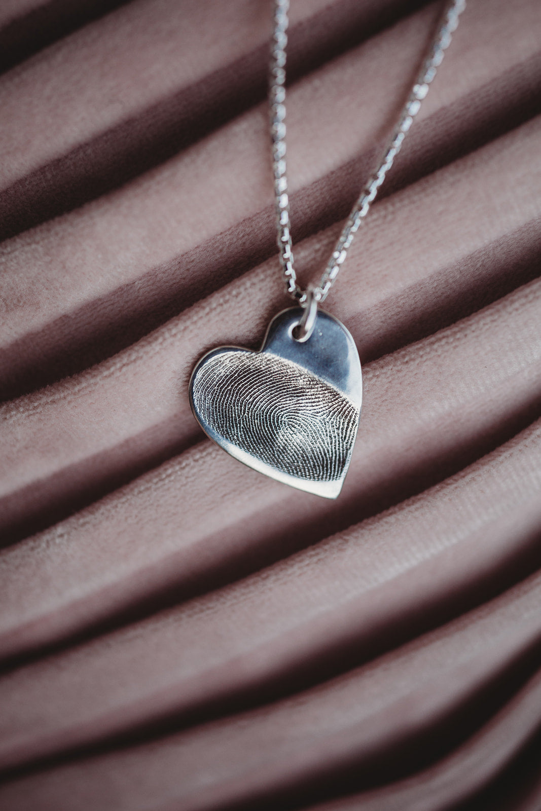 For those who prefer a classic necklace with a bit more substance, our fingerprint jewellery is the perfect choice—suitable "for him" or "for her." Capture your love one's actual fingerprint in sterling silver, or use an adult's print for a meaningful keepsake. You can visit a local jeweller for the impression or use our moulding kit at home. Select from various pendant shapes, with a hand-engraved name and age included. Complete the look with a silver link chain in one of three sizes, and optionally add a birthstone for a unique touch.