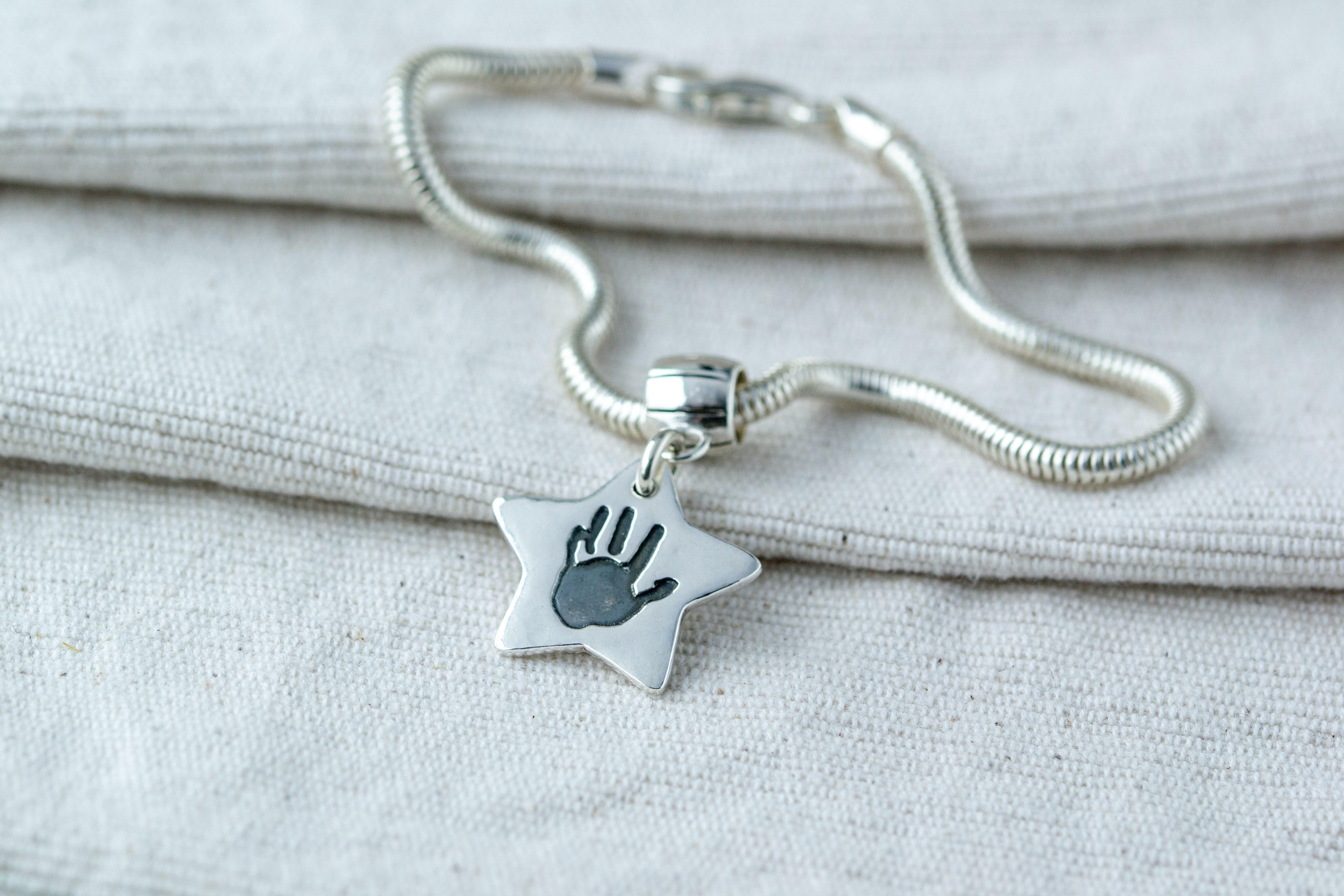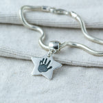 Capture handprints and footprints on a sterling silver charm and showcase it on a silky snake chain bracelet. This hand and footprint jewellery piece attaches to the bracelet with a sterling silver carrier that is also Pandora-compatible. If you already have a print or clay cast, simply upload it with your order. If not, add one of our hand & footprint kits to create a new print. Charms come in a variety of shapes, and we can engrave a name and age on the back—yes, that’s included in the price!