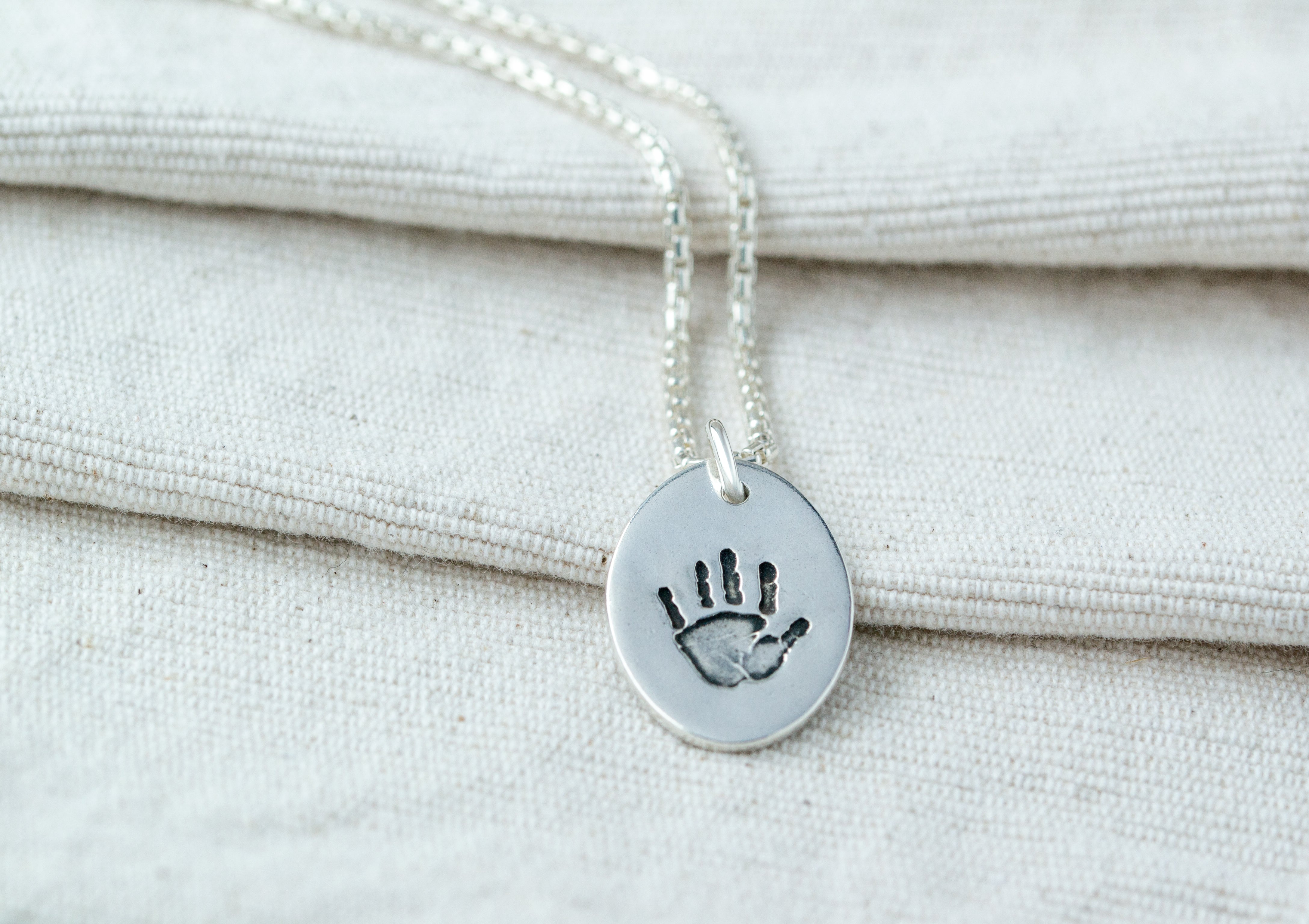 If you prefer a classic necklace with a little more substance, this might be the perfect choice—suitable "for him" as well as "for her." Capture the moment from the day your baby is born with our sterling silver pendant, featuring a hand or footprint along with a hand-engraved name and age. This pendant is a timeless piece of hand and footprint jewellery. Upload a clear picture of an existing print or clay cast with your order, or use one of our inkless hand & footprint kits to create an original print. Choose from a variety of pendant shapes, then select from three size options for your silver link chain. You can also include a birthstone for a unique, personalised keepsake.