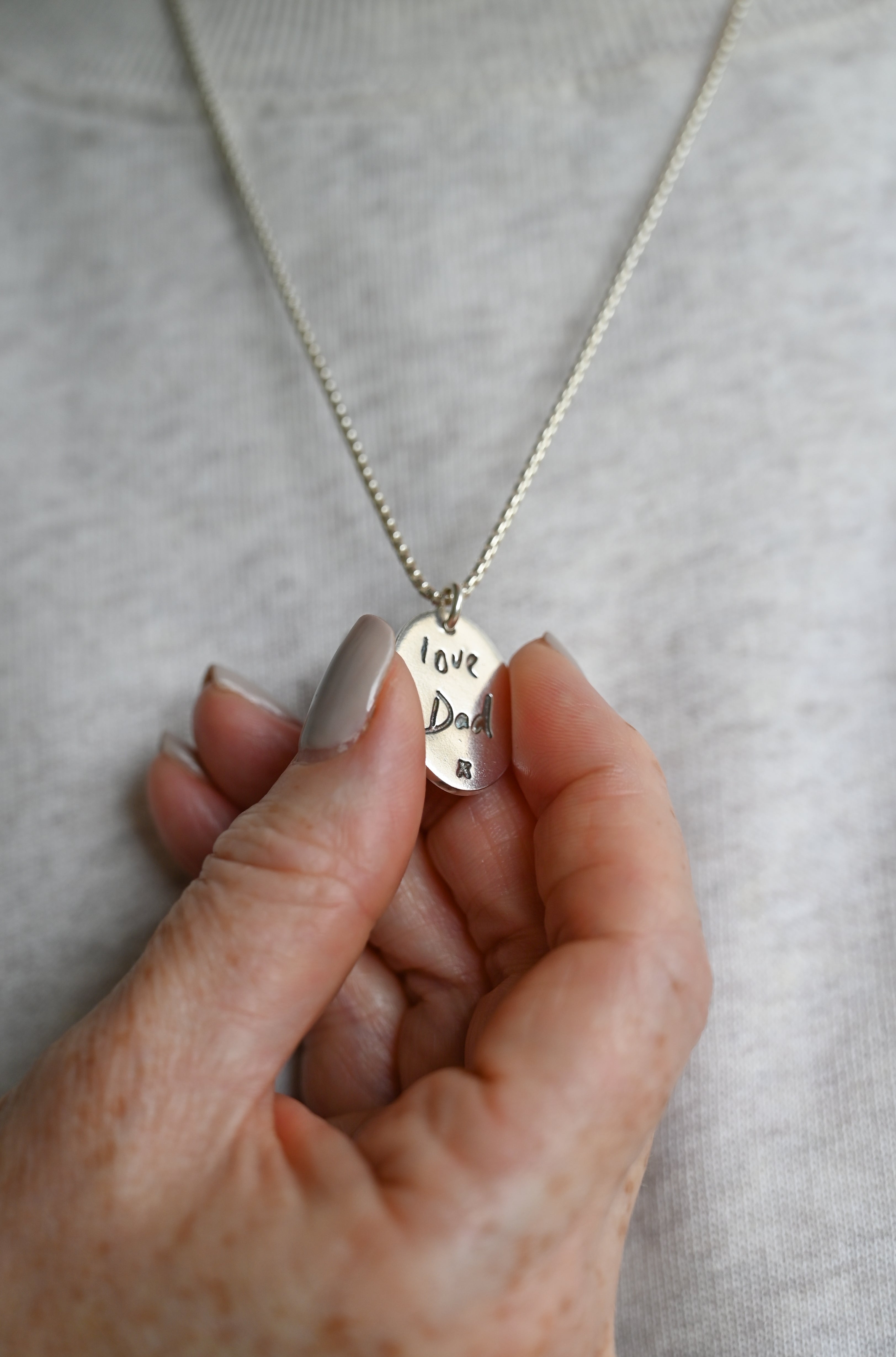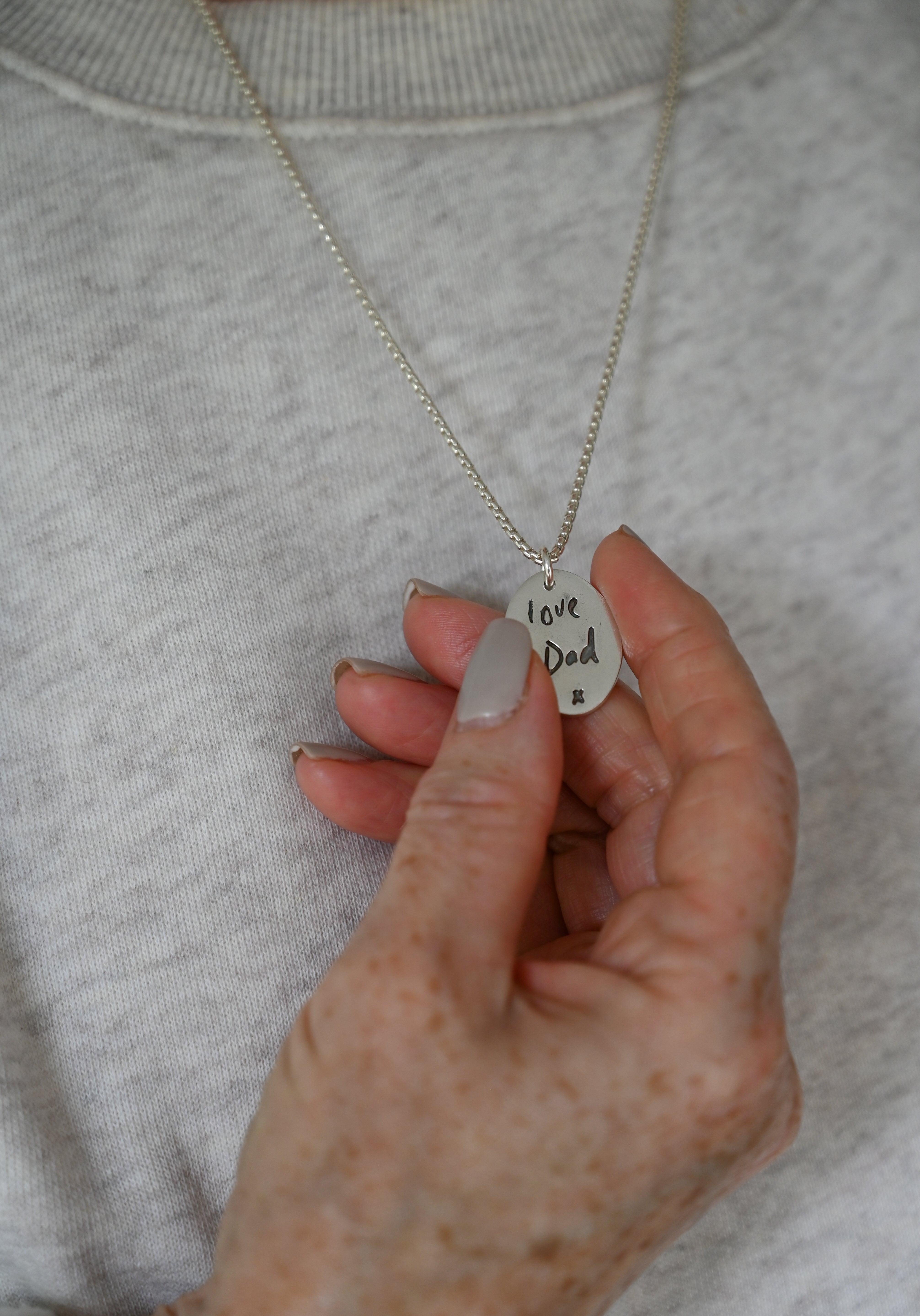 If you're searching for a silver necklace "for him," our Italian-made silver link chain is an excellent choice. It's also a popular option "for her," making it a versatile piece for anyone! Pair it with our sterling silver pendant, which features custom handwriting jewellery—a perfect way to capture an original handwritten name or phrase on one side, with a name and age engraved on the reverse. Simply take a clear picture of the handwriting and upload it with your order. Choose from a variety of pendant shapes to create a truly personalised piece. Your custom handwriting jewellery will arrive beautifully packaged, complete with a polishing cloth and care advice.