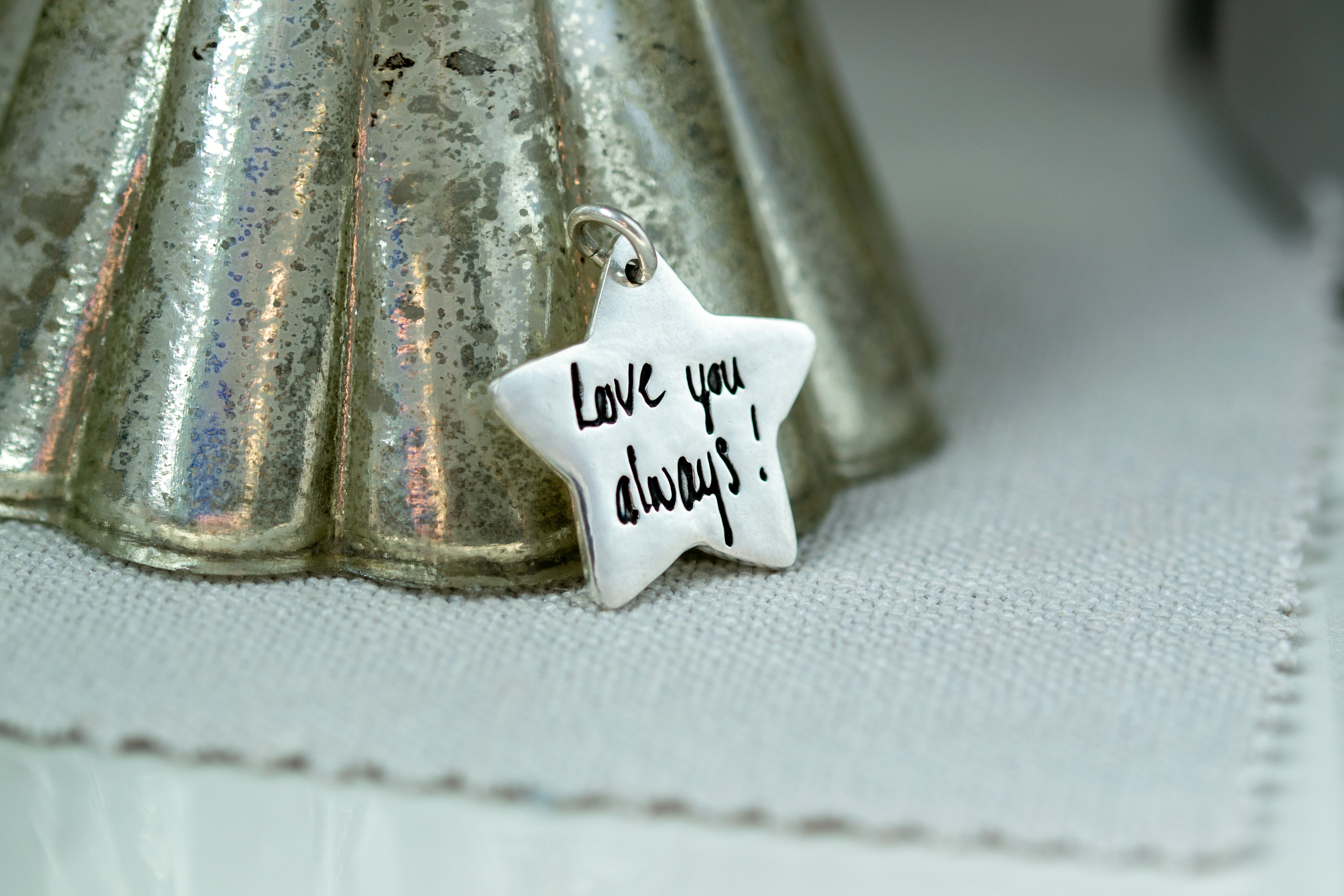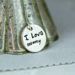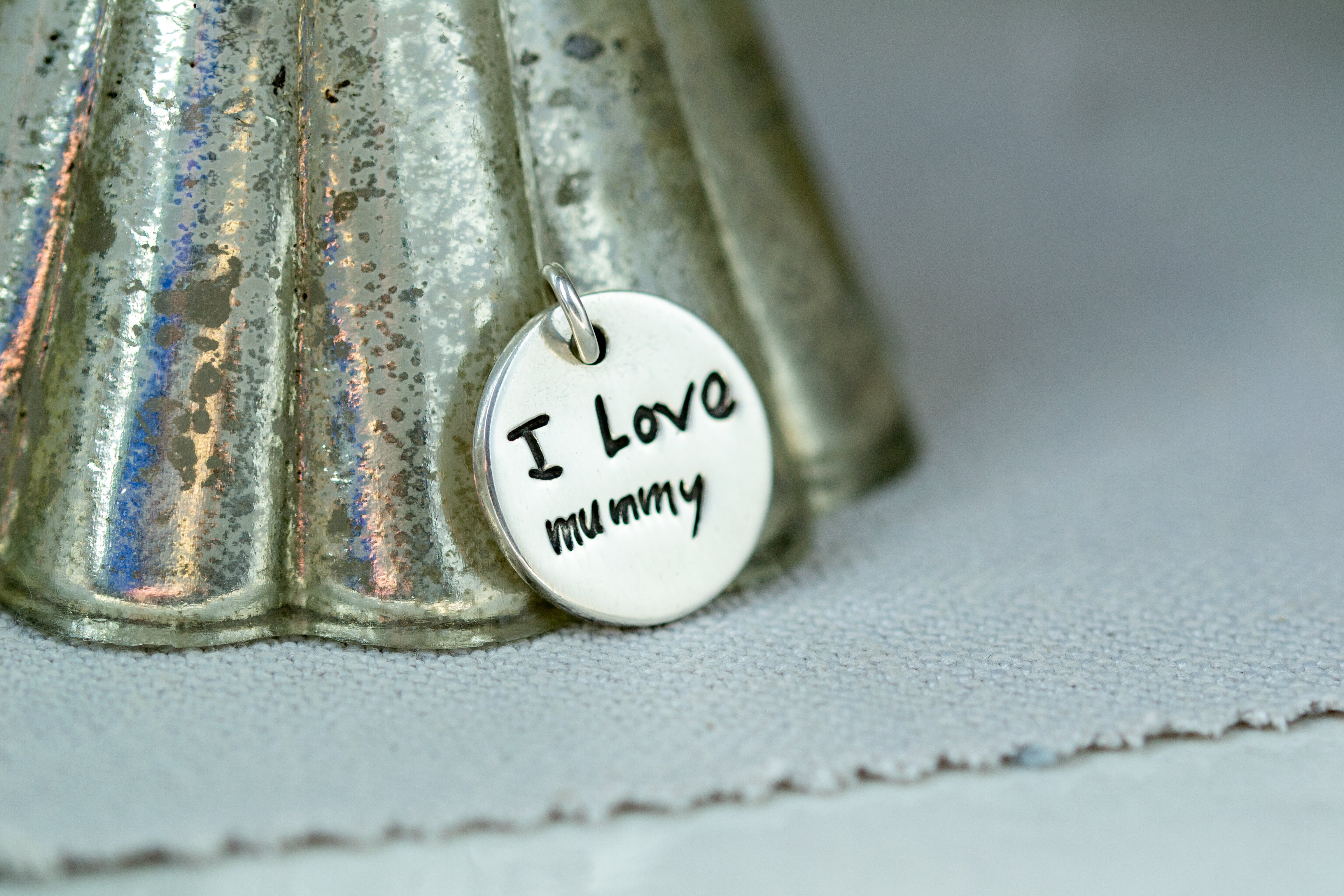 Discover the perfect addition to your necklace with our sterling silver pendant, featuring custom handwriting jewellery. Capture an original handwritten name or phrase on one side of the pendant, while a name and age can be engraved on the reverse. Each pendant is handcrafted and includes a silver jump ring, allowing it to easily attach to an existing necklace or one from our collection. Simply take a clear picture of the handwriting and upload it with your order. Choose from a variety of pendant shapes, such as the dog tag, which makes an ideal gift "for him." Your personalised handwriting jewellery will arrive beautifully packaged, complete with a polishing cloth and care instructions.