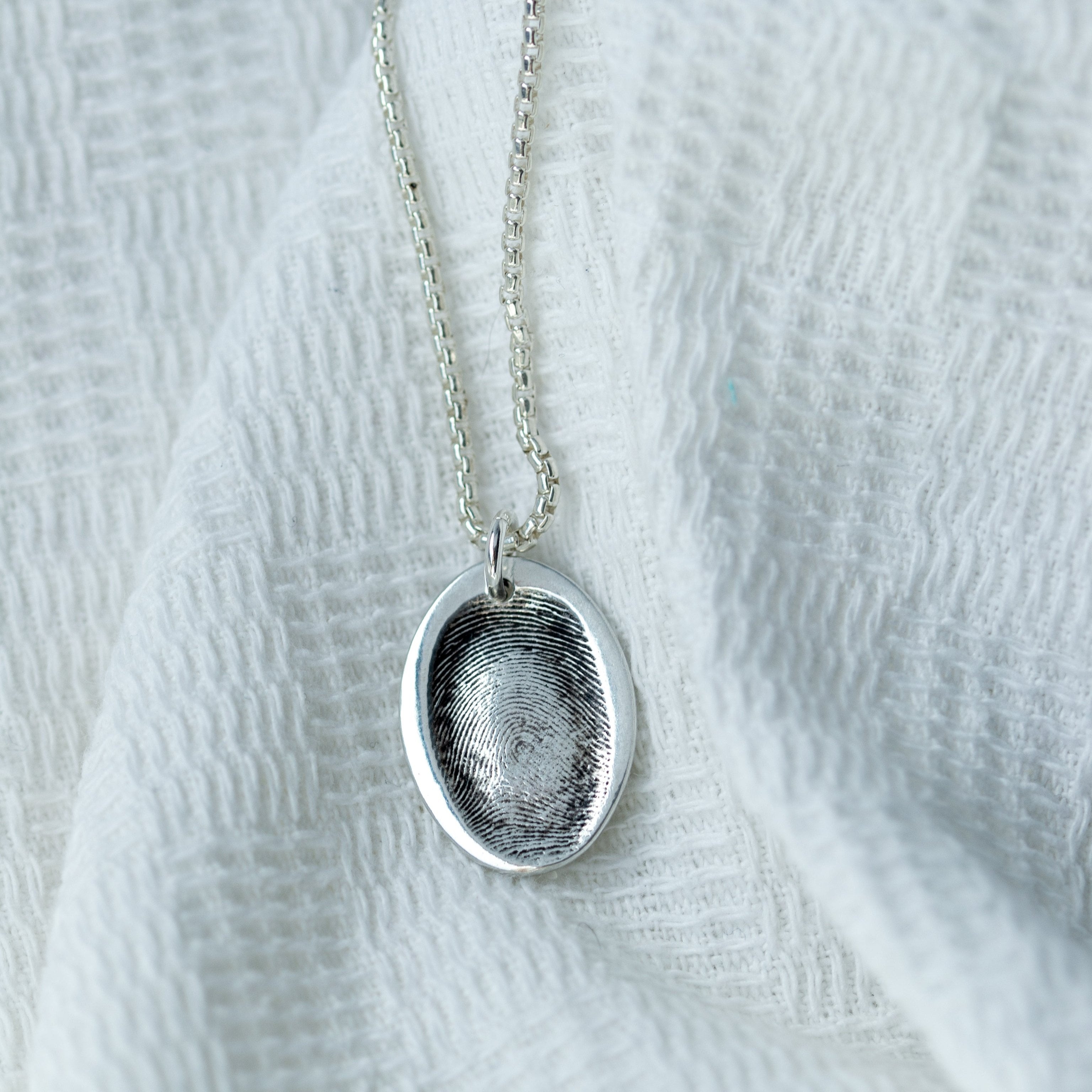 For those who prefer a classic necklace with a bit more substance, our memorial fingerprint jewellery is the perfect choice—ideal for honoring cherished memories. Capture a loved one’s actual fingerprint in sterling silver, creating a meaningful keepsake. You can visit a local jeweller for the impression or include our moulding kit with your order. Select from various pendant shapes, with a hand-engraved name and age included. Complete the look with a silver link chain in one of three sizes.