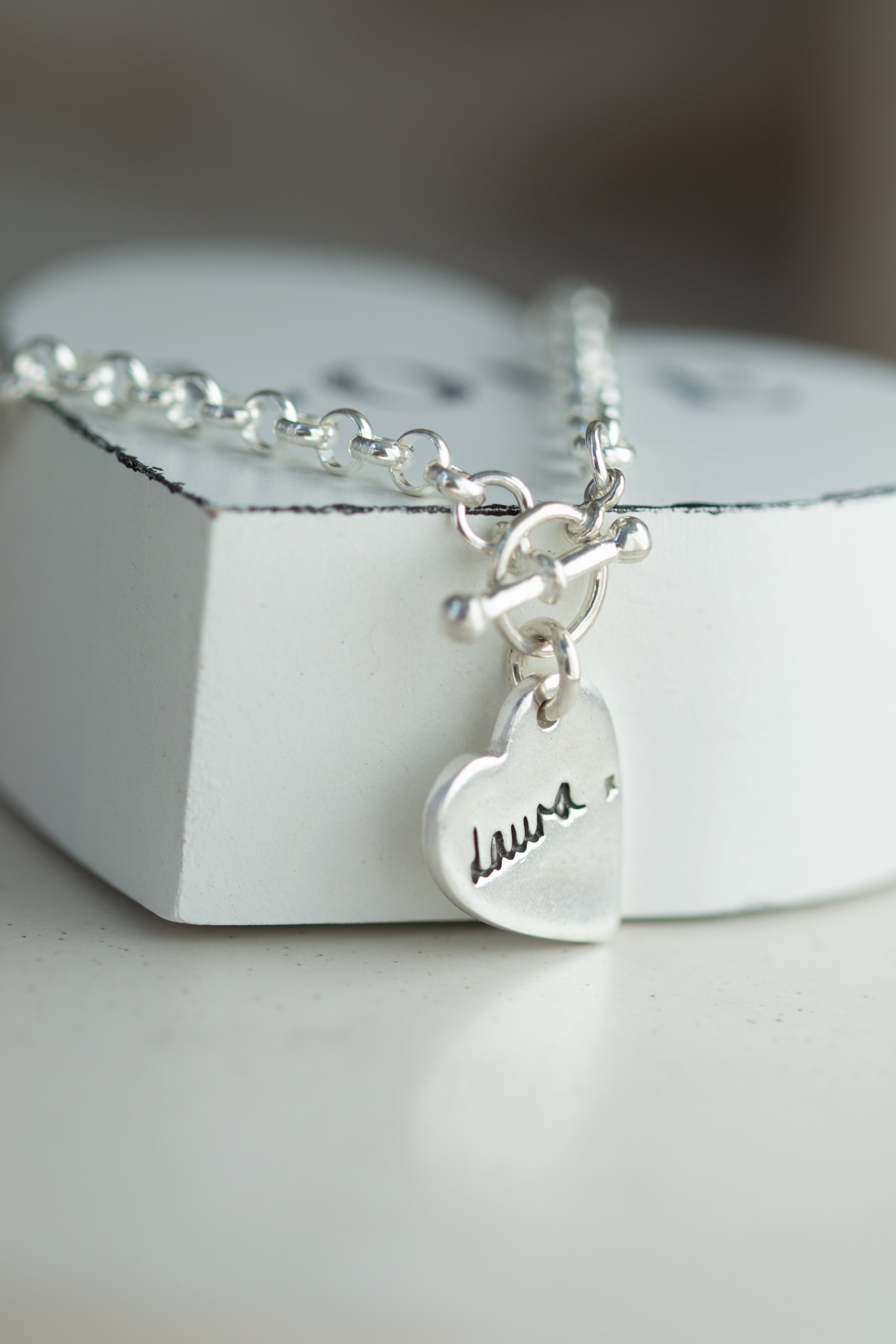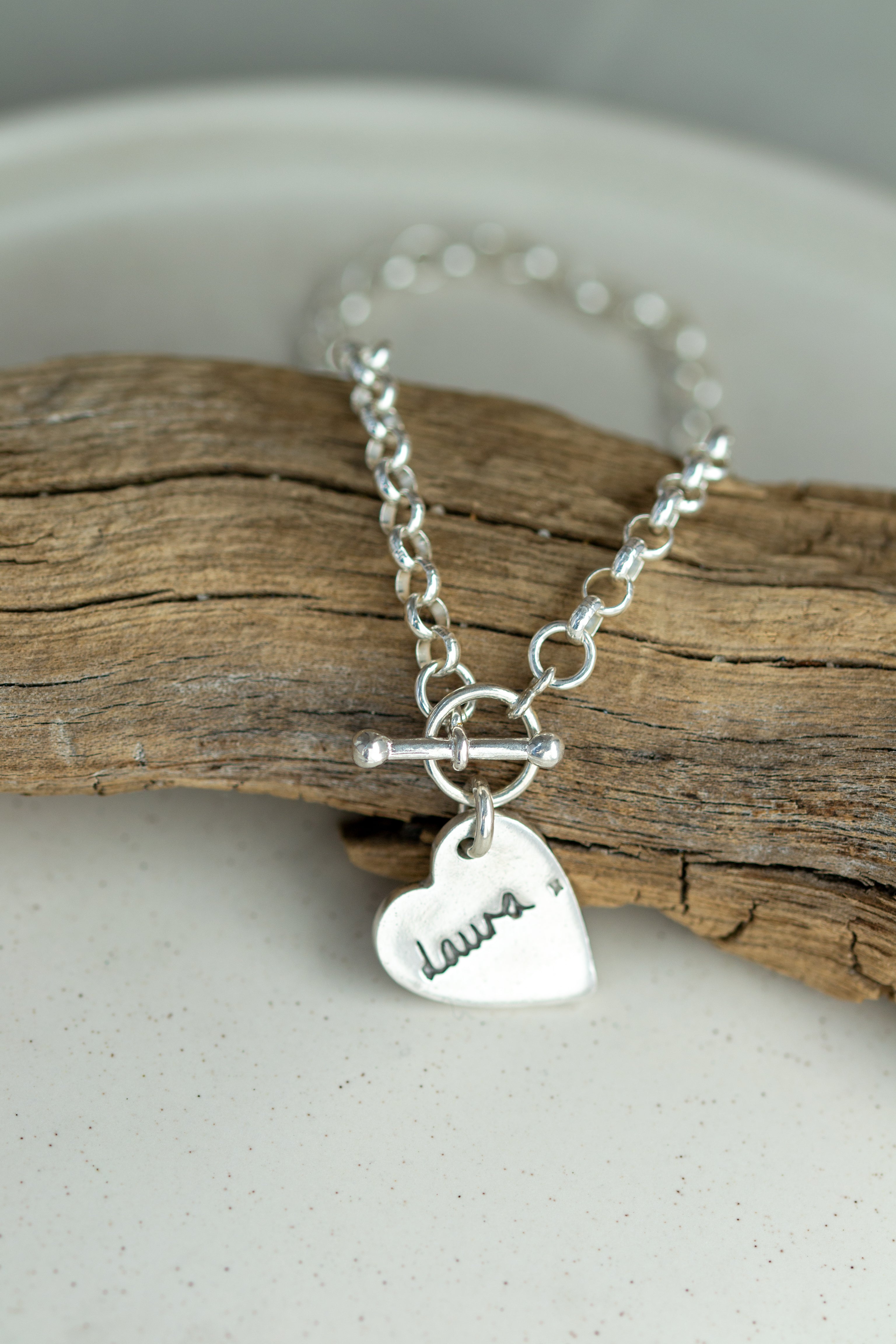 A simple sterling silver charm featuring custom handwriting jewellery is the perfect touch for your collection. This charm captures an original handwritten name or phrase on one side, with a name and age engraved on the reverse. It is elegantly attached to a delicate, Italian-made belcher bracelet. To create your personalised piece, take a clear picture of the handwriting and upload it with your order. Choose from a variety of charm shapes to suit your style. Your finished personalised jewellery will be delivered beautifully packaged, complete with a polishing cloth and care advice.